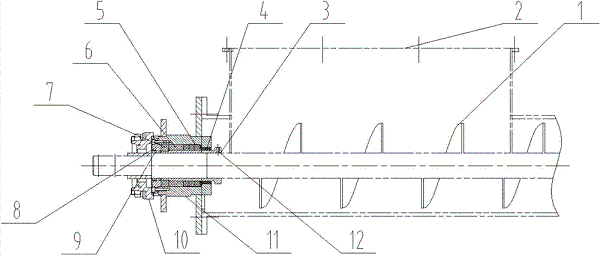 本技術(shù)新型涉及 螺旋輸送機(jī) 輸送領(lǐng)域,具體屬于應(yīng)用于食品、化工、醫(yī)藥、糧食行業(yè)的螺旋輸送機(jī)防漏粉軸承密封裝置。 背景技術(shù): 在化工、食品、醫(yī)藥、糧食行業(yè),物料都需要有距離的輸送,螺旋輸送機(jī)是在這種情況下常用的輸送方式。現(xiàn)有的螺旋輸送機(jī)在使用時(shí),常出現(xiàn)兩端密封座因密封不嚴(yán),密封端物料泄露嚴(yán)重漏料,泄漏物滲入軸承內(nèi),就會(huì)造成螺旋輸送機(jī)運(yùn)轉(zhuǎn)一段時(shí)間軸承座的軸承便會(huì)卡死。同時(shí)也會(huì)造成物料浪費(fèi),污染環(huán)境。 技術(shù)實(shí)現(xiàn)要素: 本技術(shù)的目的是提供一種螺旋輸送機(jī)防漏粉軸承密封裝置,為化工、醫(yī)